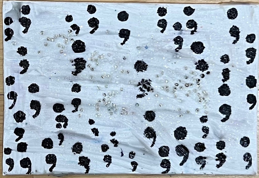 As per usual, I just started somewhere and then got somewhere else accidentally completely; meaning, despite my desire to make all these pieces that go together in some way, the only thing they have in common is that there are obvious images of a semi-colon; it’s annoying that my Adhd extends to such wishi washiness; on the other hand, if I for once wanted to sound positive about my work, it’s a cool process that mirrors the semi-colon itself; it’s seems simple and not that interesting and then it becomes more and more full of possibilities. I started with the boring idea of making a semi-colon in the center of the canvas; then I used duck tape and a mirror for the top period; a big moment was the realization that my panel could be horizontal and have lots of semi-colons all over; later I realized I could use magazine collage in a fun way; I’m not done yet; here are two of them: