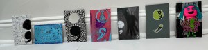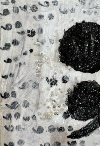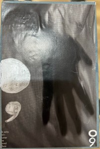 Not a great photo of the piece but interesting as a photo itself with the shadow of the phone over the bottom part of the canvas.This favorite one was fun using collage and paint pen with a central image of a shadow of a hand. Now I’m realizing the next ones need to express something with a shadow symbolizing the duality of the semi-colon.